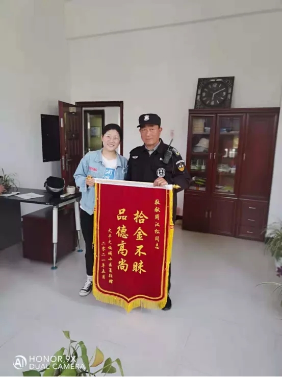 當天中午,夏女士來到物業服務中心取回手機,對物業服務處的工作人員幫其找回了手機表示感激,并提出想請周漢松吃飯以示感謝。周漢松婉言謝絕了她的好意,并稱這是其應當做的,本分之內的事。幾天后,夏女士帶著繡有“拾金不昧·品德高尚”的錦旗來到物業客服中心前臺,以表達自己對物業工作人員的謝意。