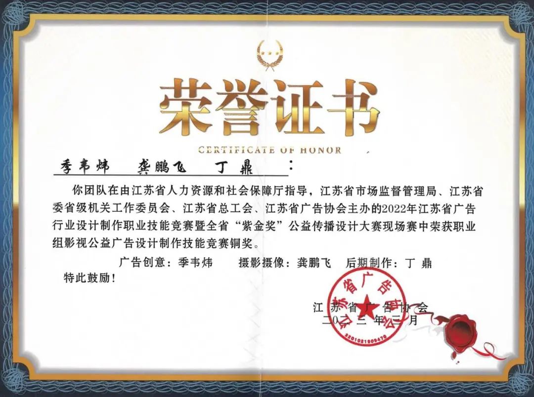 近日,由江蘇省人力資源和社會保障廳指導,江蘇省市場監督管理局、江蘇省委省級機關工作委員會、江蘇省總工會、江蘇省廣告協會主辦的2022年江蘇省廣告行業設計制作職業技能競賽暨全省“紫金獎”公益傳播設計大賽在南京圓滿收官。鹽城港文旅集團廣告傳媒分公司參賽團隊現場創作的《共圓強國復興夢》短視頻作品大賽榮獲職業組影視公益廣告設計制作技能競賽銅獎。