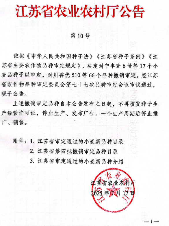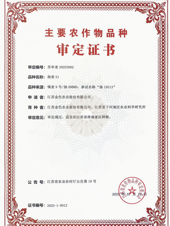近日,江蘇省農業農村廳發布第10號文件公告,宣布由江蘇金色農業股份有限公司與里下河地區農業科學研究所聯合選育的小麥新品種“揚麥51”正式通過江蘇省農作物品種審定委員會的審定,審定編號為:蘇審麥20253002。