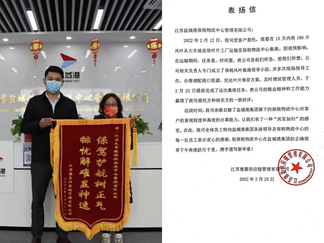 鹽城港保稅物流中心圍繞集團(tuán)黨委“經(jīng)營(yíng)興航年”“改革攻堅(jiān)年”部署要求,秉承“客戶至上,服務(wù)為本”的經(jīng)營(yíng)理念,不斷提升服務(wù)水平,提高專業(yè)素養(yǎng)。同時(shí),保稅物流中心為切實(shí)做好疫情防控工作,針對(duì)進(jìn)出貨物采取劃界作業(yè),裝卸專班人員區(qū)域內(nèi)作業(yè)等要求,真正做到了生產(chǎn)經(jīng)營(yíng)、疫情防控兩手抓、兩手硬、兩不誤。細(xì)致周到、高效便捷的服務(wù)也贏得了社會(huì)各界的廣泛贊譽(yù),部分客戶還特意送來了錦旗和感謝信以表達(dá)他們的感激之情。
