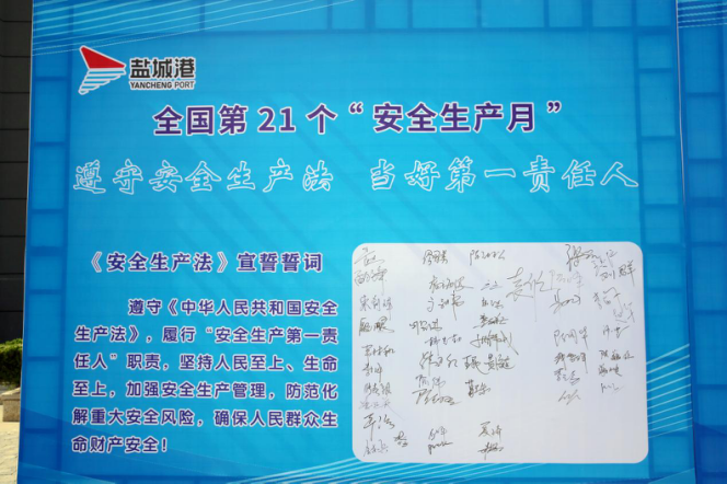 “我鄭重宣誓:遵守《中華人民共和國安全生產法》,履行‘安全生產第一責任人’職責,堅持人民至上、生命至上,加強安全生產管理,防范化解重大安全風險,確保人民群眾生命財產安全!”活動期間,在大豐港區主要負責同志的統一領誓下,全體人員高舉右手,緊握拳頭,鏗鏘有力地宣讀《安全生產法》宣誓誓詞。