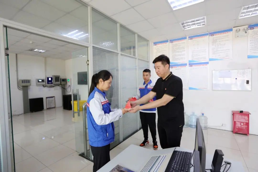 活動(dòng)結(jié)束后,港區(qū)相關(guān)負(fù)責(zé)人將西瓜送至各單位一線在崗員工,為他們解暑降溫、鼓舞干勁。
