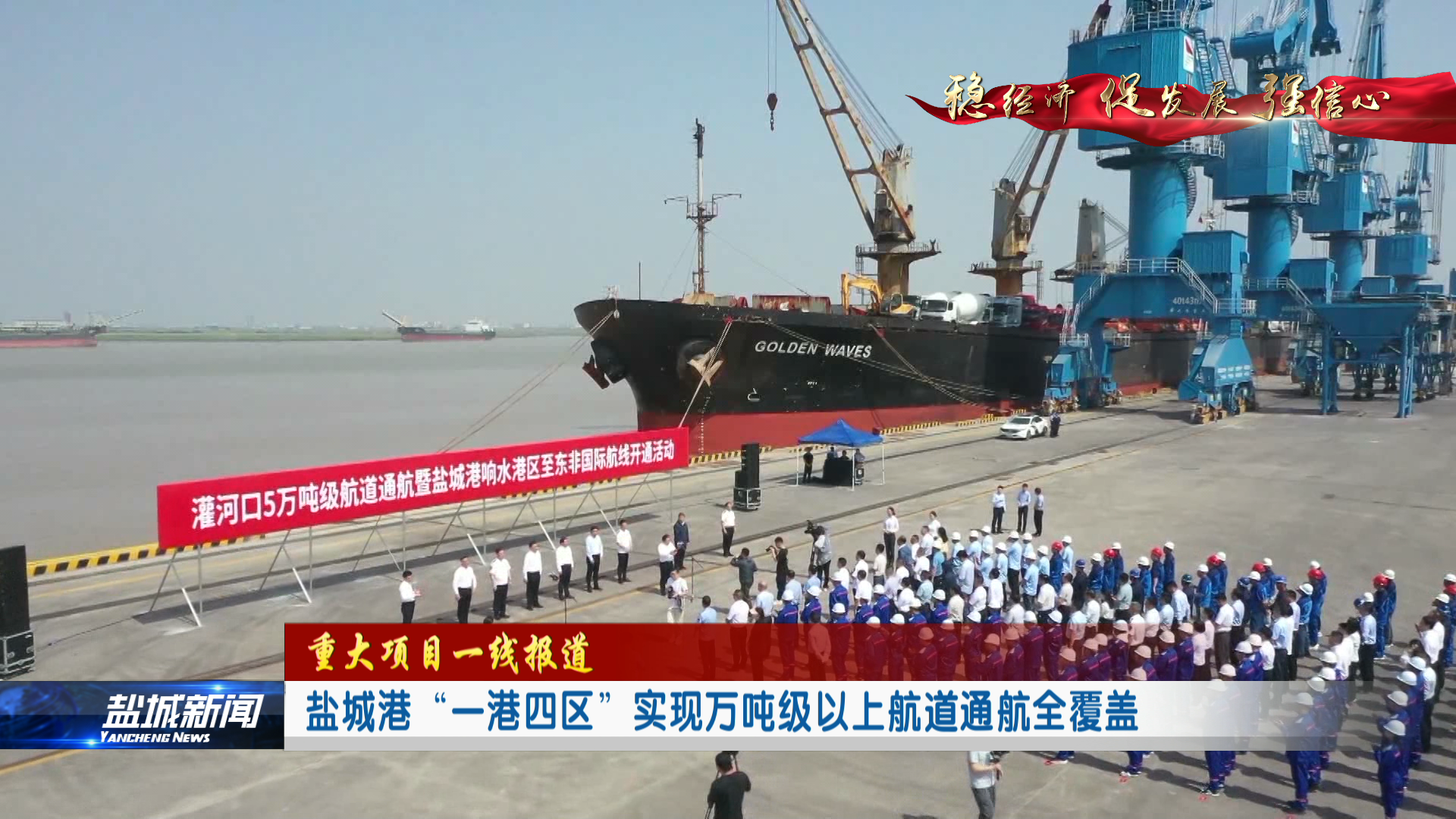 6月13日上午,隨著一陣鳴笛聲,停泊在響水港區(qū)5號(hào)碼頭的5萬噸級(jí)金波輪整裝待發(fā),即將開始它的東非之旅。這標(biāo)志著灌河口5萬噸級(jí)航道暨鹽城港響水港區(qū)至東非國際航線正式通航,為鹽城走向世界海上大通道描上厚重的一筆。