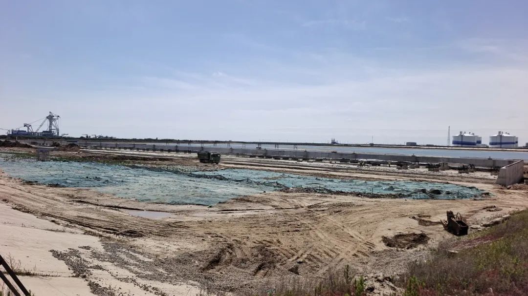 目前碼頭區域地連墻、灌注樁、高壓旋噴樁、錨碇梁、樁基、胸墻、鋼拉桿安裝已完成,現澆卸荷承臺完成92.8%,灌砌塊石完成86.9%。堆場部分原位固化、降水強夯、樁基已全部完成,6%水泥土已完成65%,排水溝完成29.2%,混凝土井完成86%,管道混凝土包封完成50.9%。