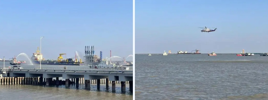 演習模擬LNG船舶,在碼頭卸貨時LNG意外泄漏,隨后展開泄漏可燃氣體消防稀釋、人員和船舶緊急疏散撤離、落水人員搜救等應急處置。