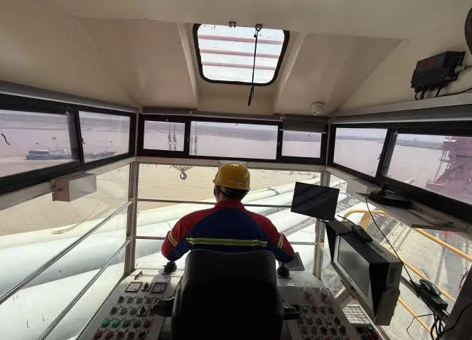 抓斗起落在數(shù)十米的高空中劃出流暢弧線,鋼齒咬合的瞬間,貨物簌簌滑落,門(mén)機(jī)室的玻璃接住了陽(yáng)光拋來(lái)的金線,織進(jìn)了門(mén)機(jī)工的工裝里。他們心無(wú)旁騖,雙手穩(wěn)如磐石,憑借毫米級(jí)的操作精度,滿載時(shí)控制抓斗勻速下沉,避免貨物散落;空載時(shí)調(diào)整角度規(guī)避障礙物,確保設(shè)備與人員安全,全力提升港區(qū)貨物吞吐量,為港區(qū)完成年度目標(biāo)任務(wù)貢獻(xiàn)力量。