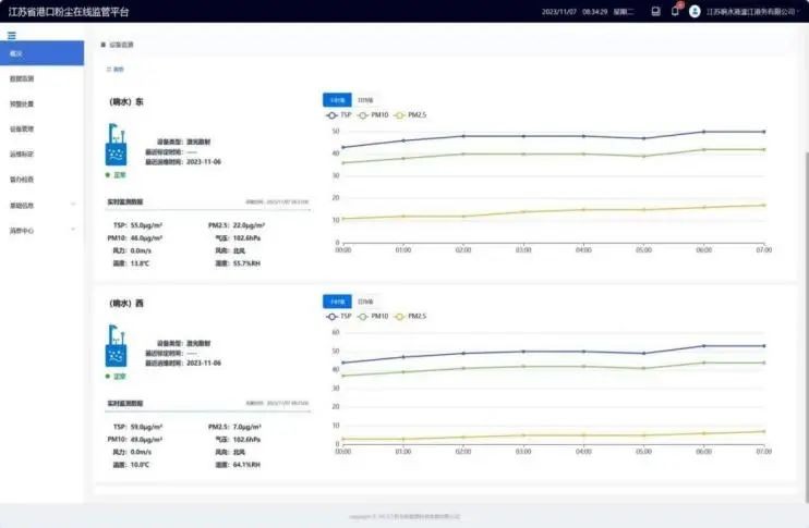 基于激光散射的監(jiān)測設(shè)備和江蘇省港口粉塵在線監(jiān)管系統(tǒng)上線后,通過碼頭東側(cè)和西側(cè)的2個揚塵在線監(jiān)測儀,能掃描整個散貨作業(yè)碼頭,實時獲得碼頭作業(yè)區(qū)的PM2.5、PM10、TSP總懸浮顆粒物濃度數(shù)據(jù),實現(xiàn)碼頭全域100%監(jiān)測全覆蓋。